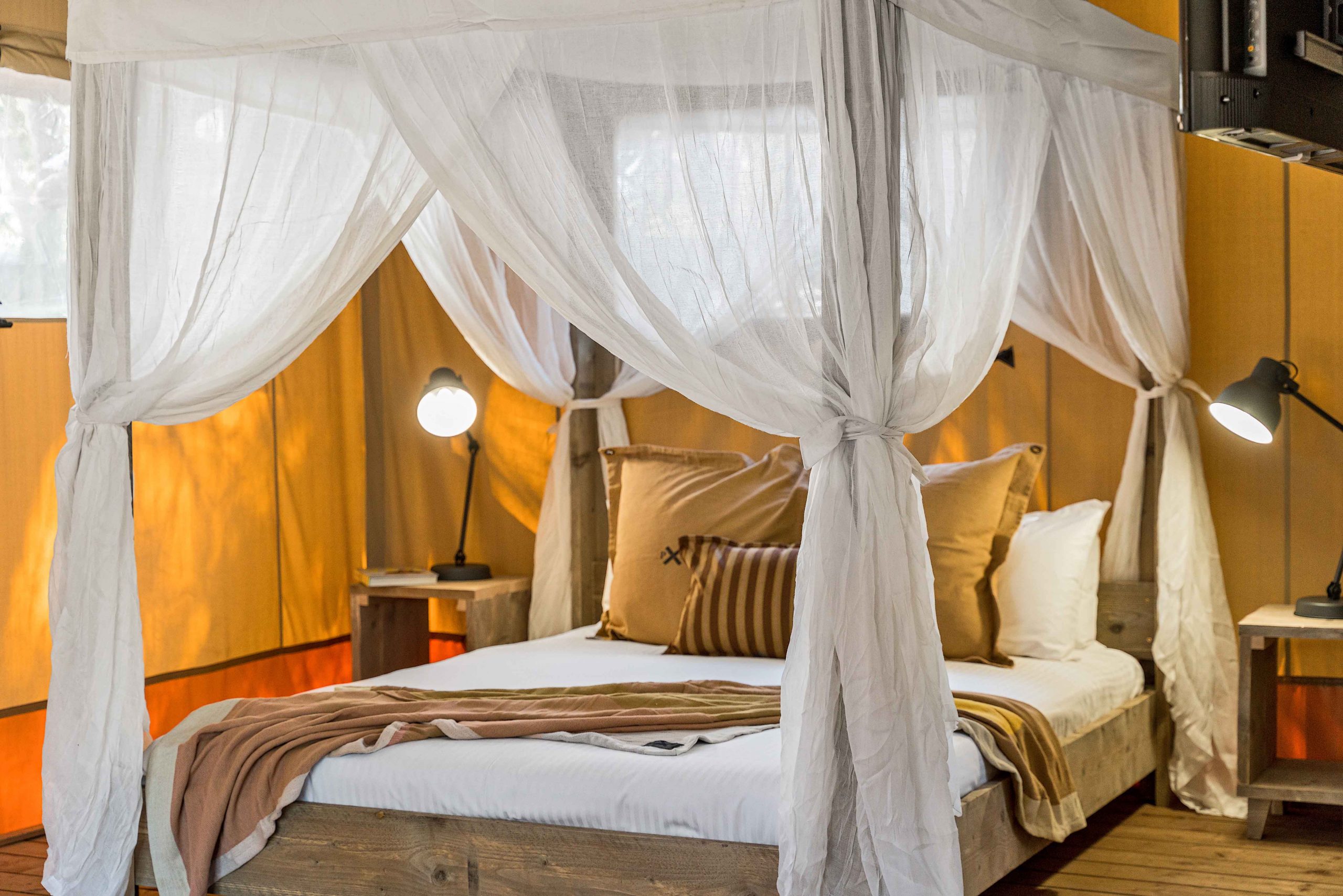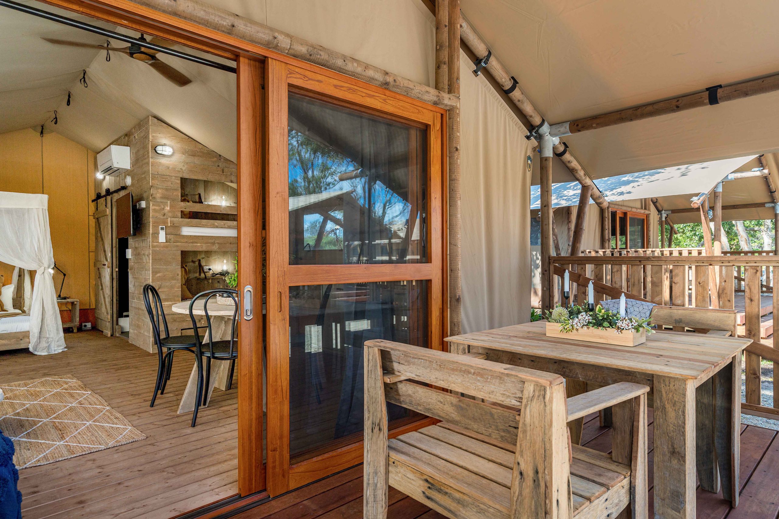 Our open-plan glamping layout is perfect for couples and small families - complete with sturdy bunk beds, four-poster bed, modern bathroom, private & covered patio, kitchen, BBQ, aircon and reverse-cycle heating for your ideal home away from home. Naturally, linen and essential amenities are provided.
